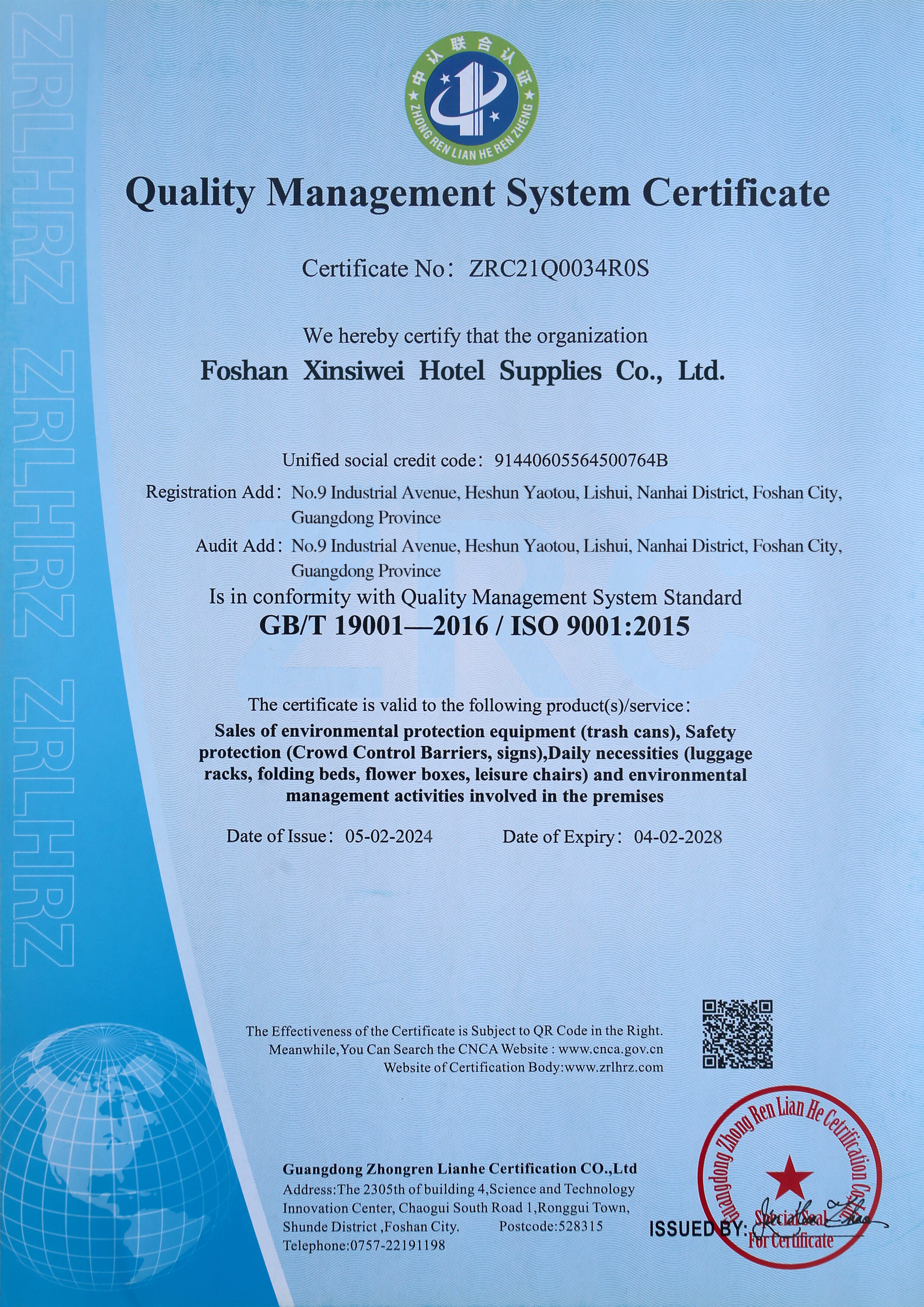 Foshan Xinsiwei Hotel Supplies Co., Ltd. was established in 2010. The plant covers an area of 20,000 square meters and has more than 100 employees. It has advanced equipment, hardware stamping equipment, and automatic welding production technology. It is a company integrating R&D, manufacturing, and sales. The main products are: trash cans, signs, railing seats, service carts, wine carts, folding beds and other hotel supplies. Products are exported to many countries around the world